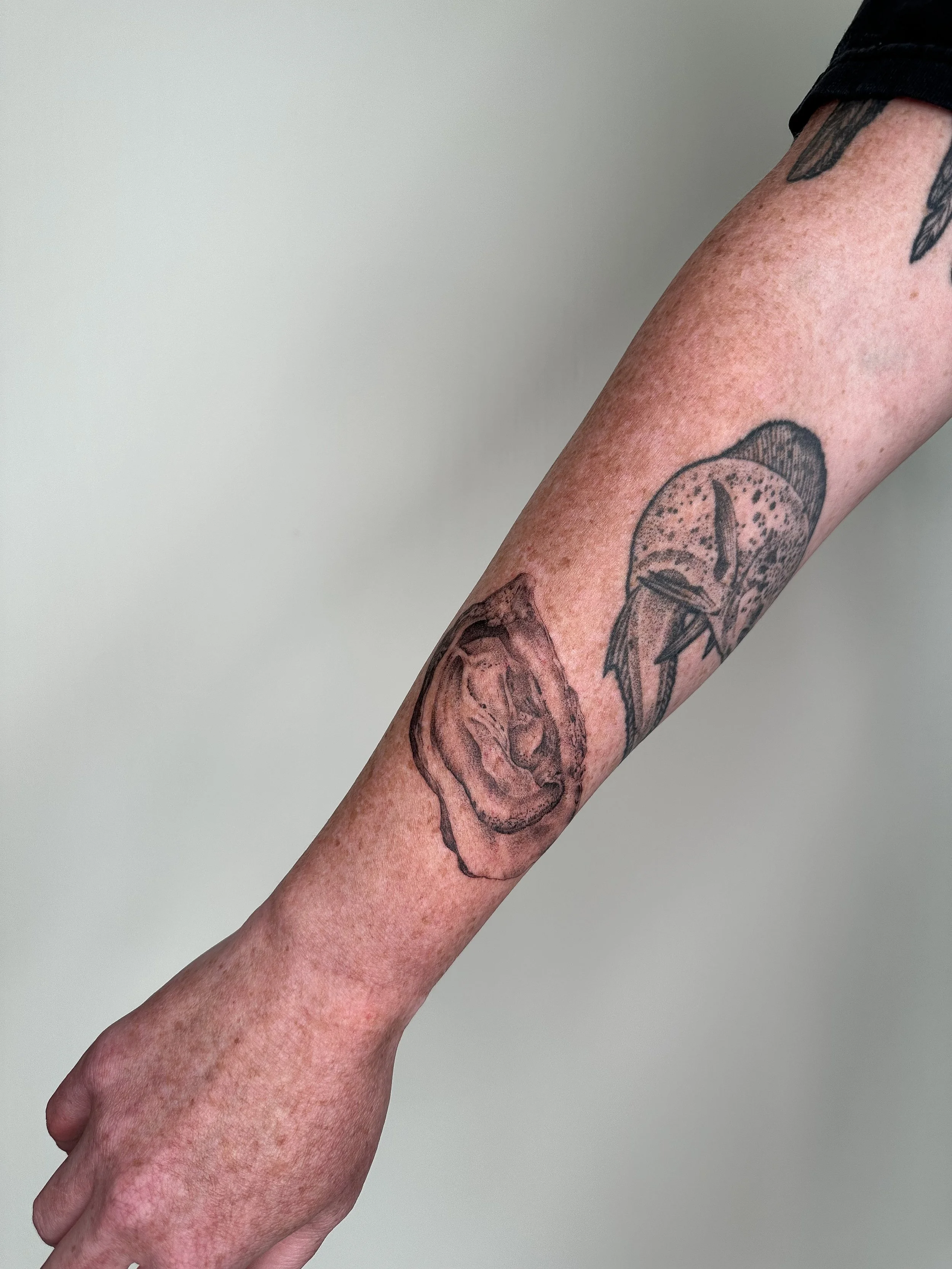 Jessica was just finishing her PhD in fish research and wanted a tattoo to celebrate her accomplishment. I am so grateful she choose me for this unique sturgeon tattoo and I loved discussing fish ear bones and all her amazing research.